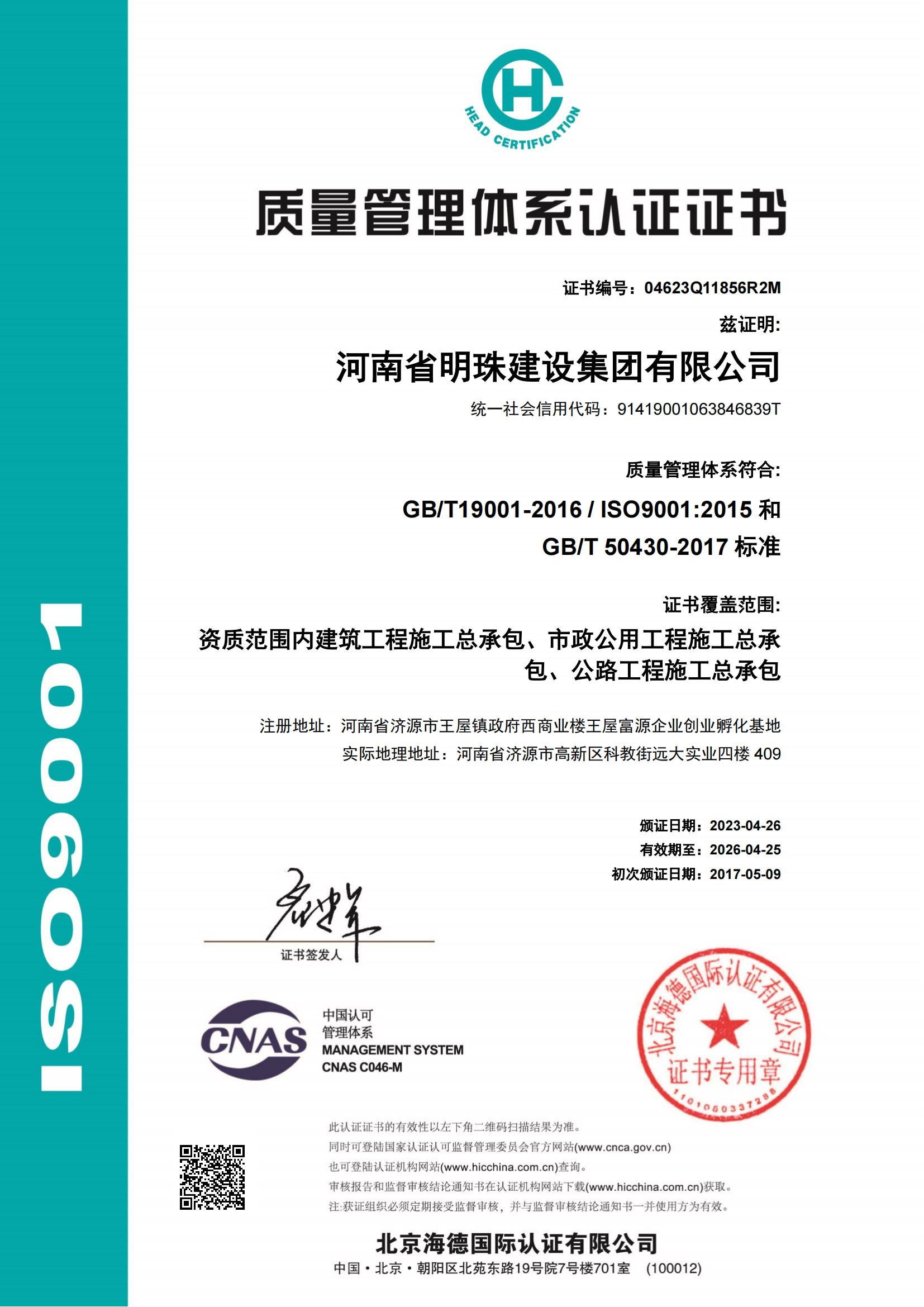 質量體系認證證書