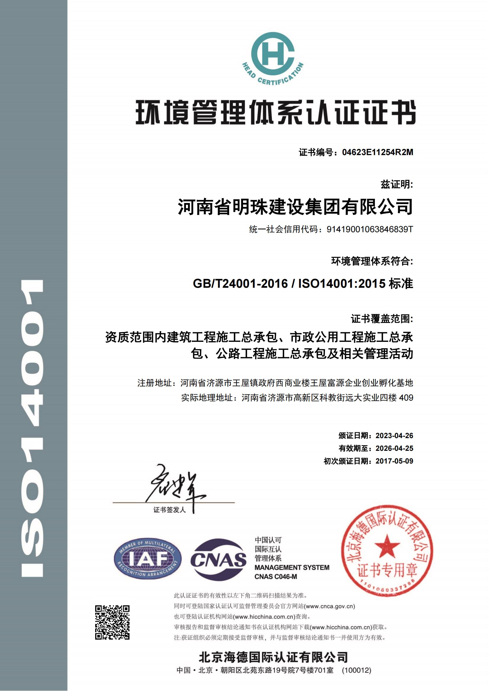 環境體系認證證書