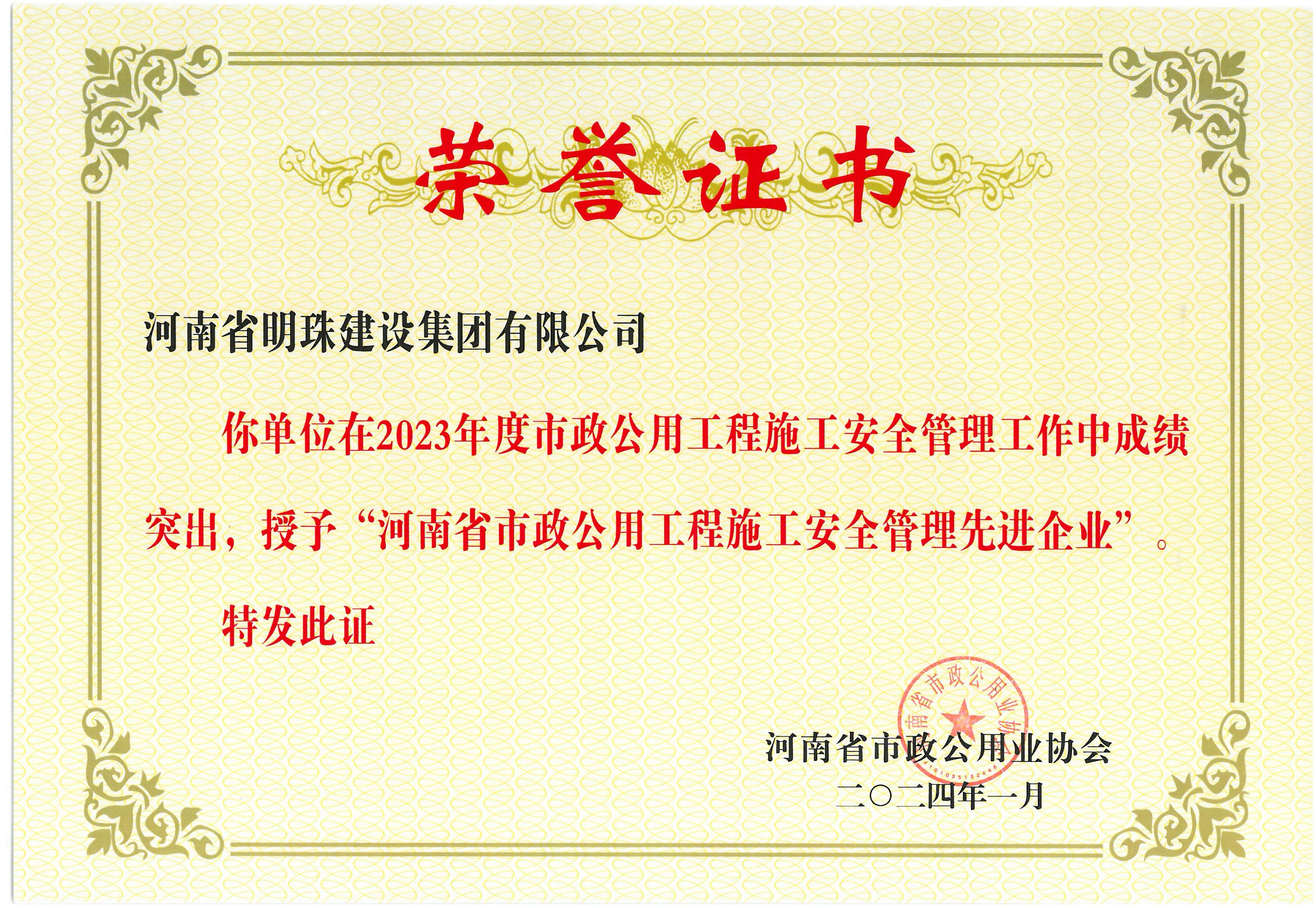 河南省市政公用工程施工安全管理先進企業