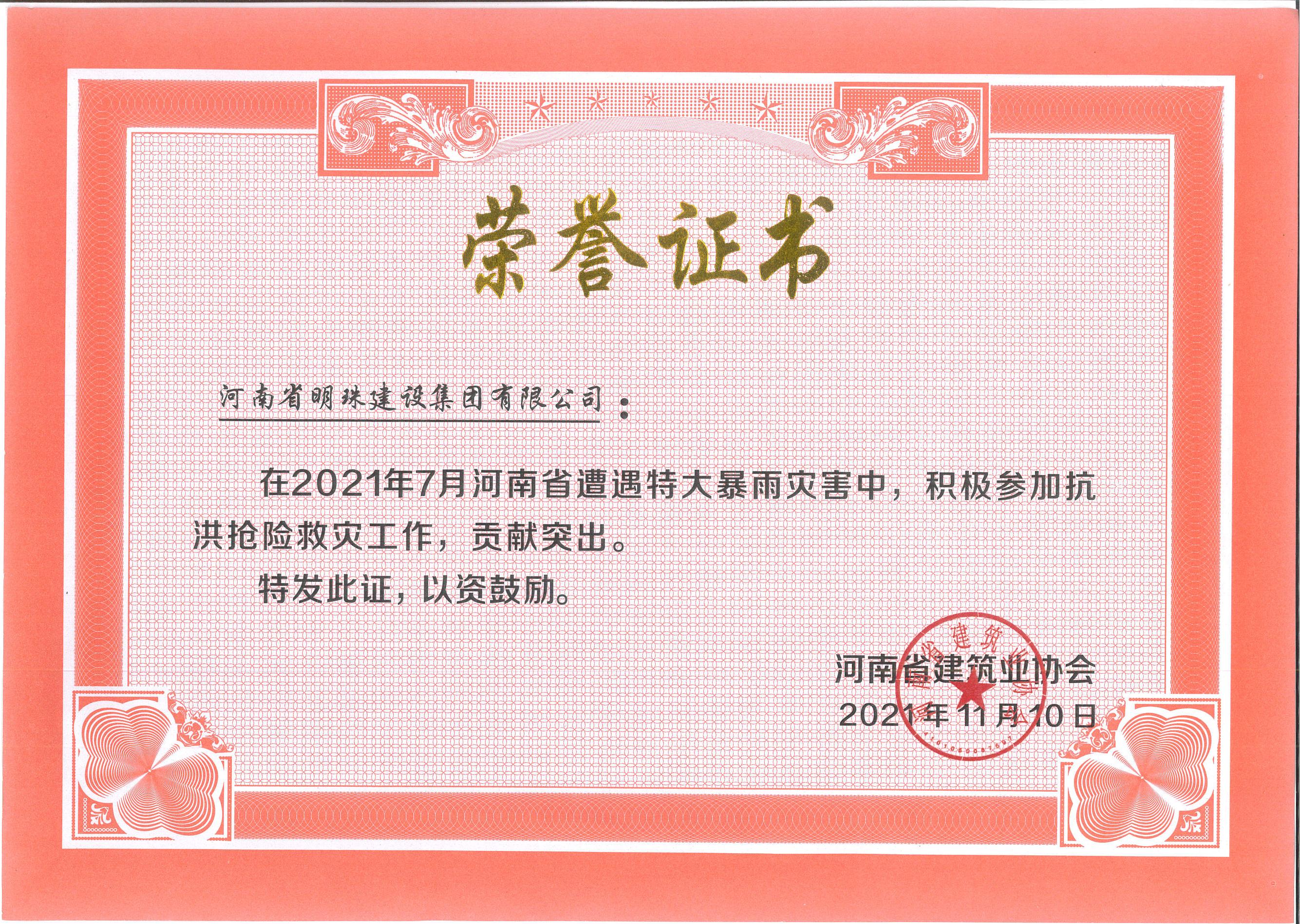 2021年河南省特大暴雨抗洪搶險(xiǎn)救災(zāi)榮譽(yù)證書(shū)
