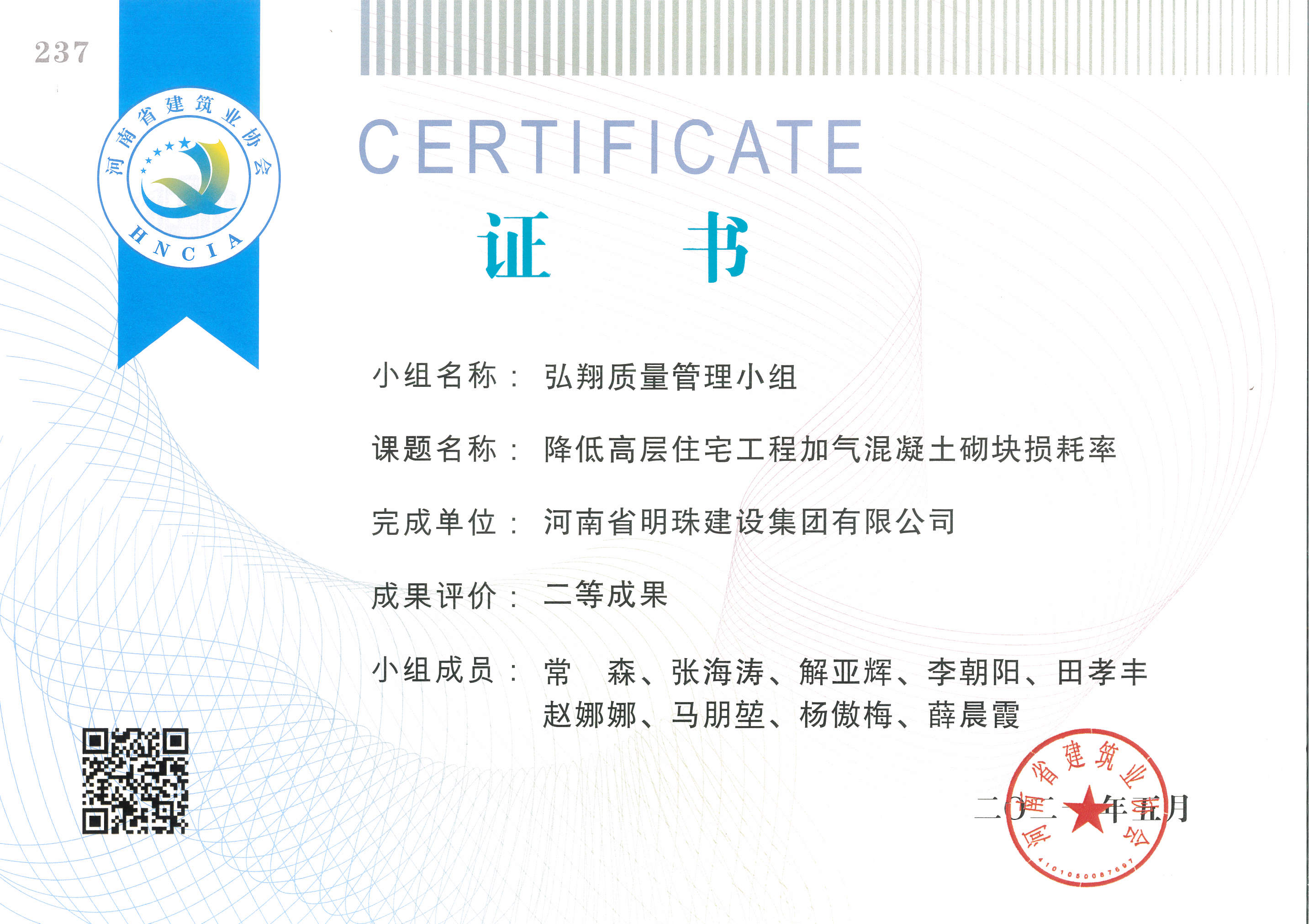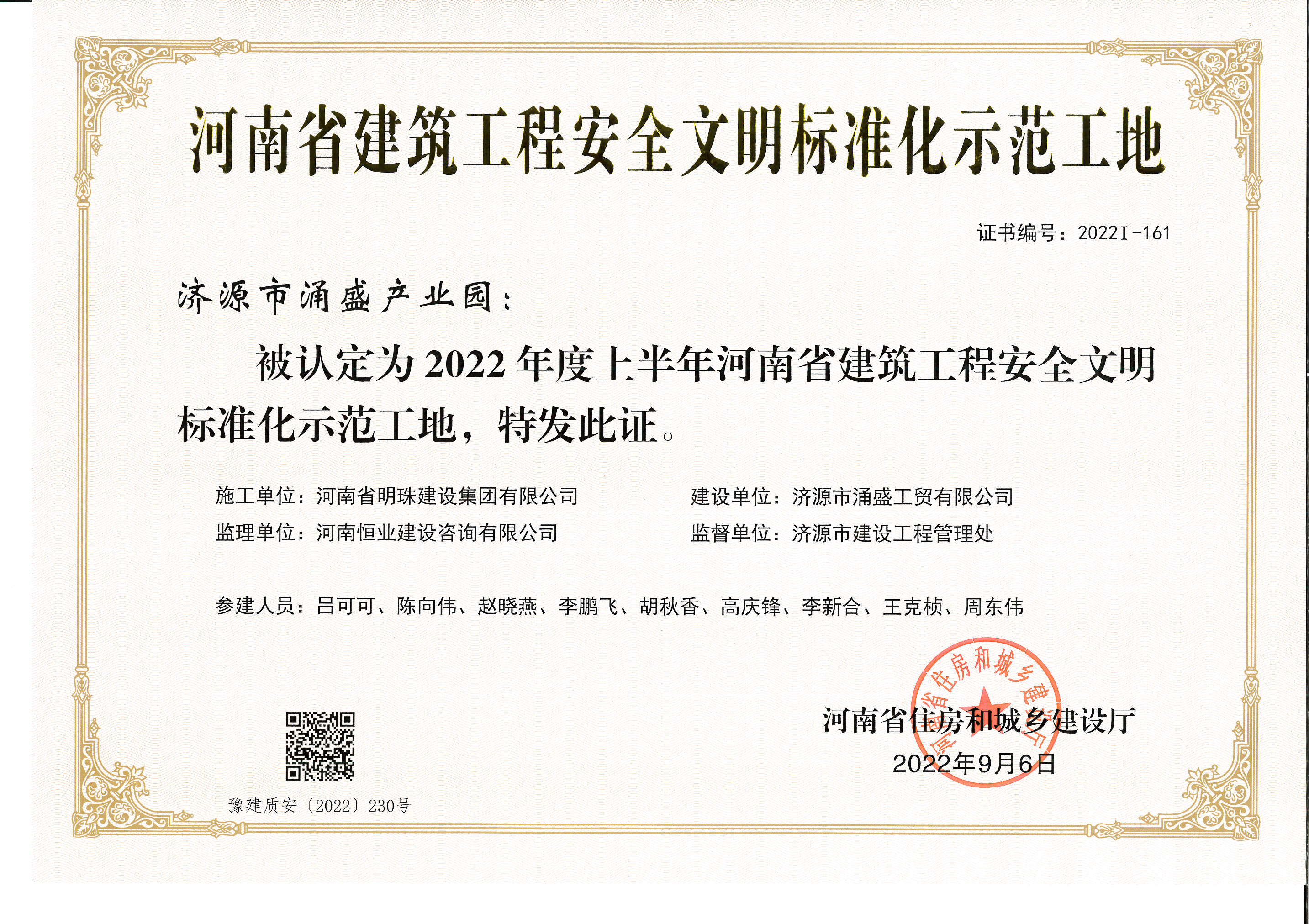 2022年度上半年河南省建筑工程安全文明標(biāo)準(zhǔn)化示范工地證書(shū)